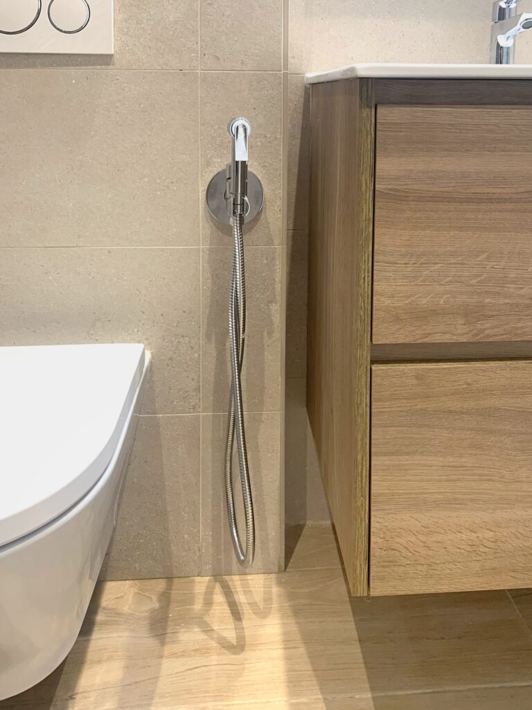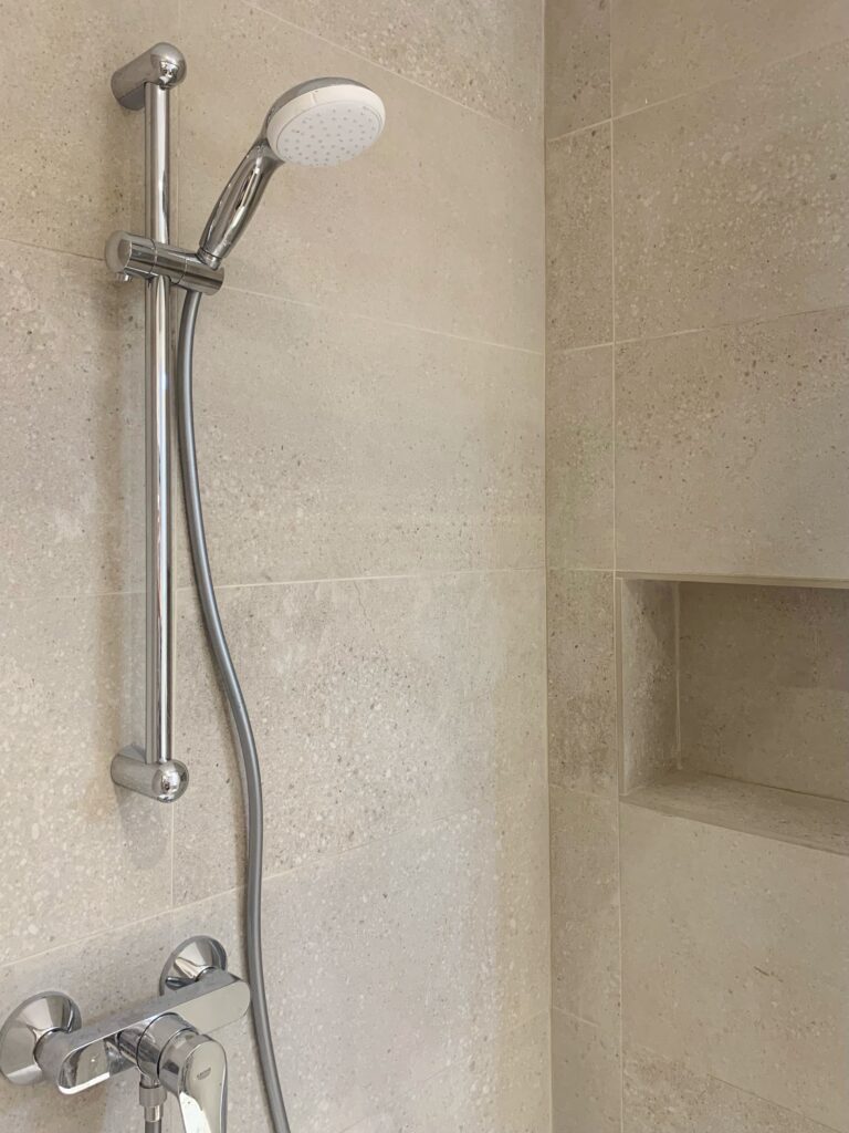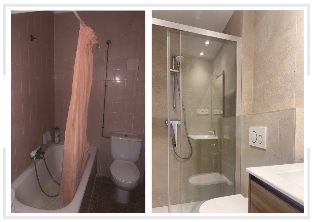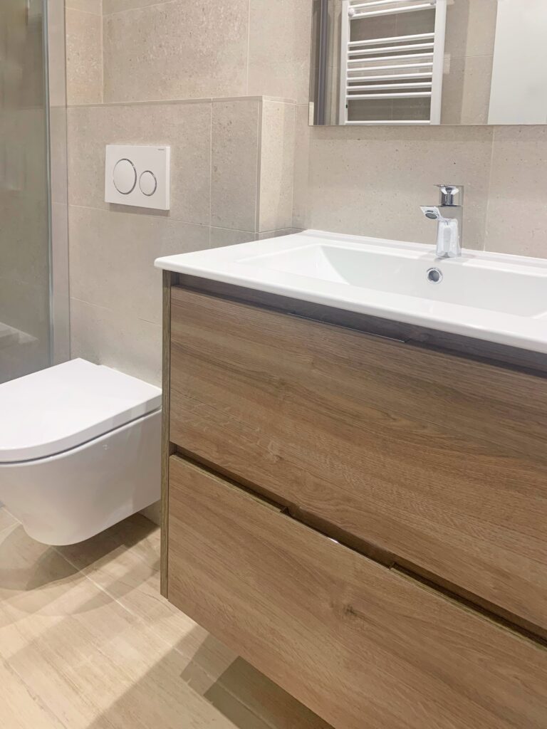En el baño se modifica la entrada y la distribución por completo para aprovechar al máximo el espacio con un gran plato de ducha, inodoro suspendido y mueble de baño. La baldosa seleccionada para paredes de este baño queda perfecta, no solo por el color y textura con la luminosidad y calidez que aporta, si no también por los perfectos remates que permite en los cantos, aportando limpieza sin necesidad de instalar cantoneras.
