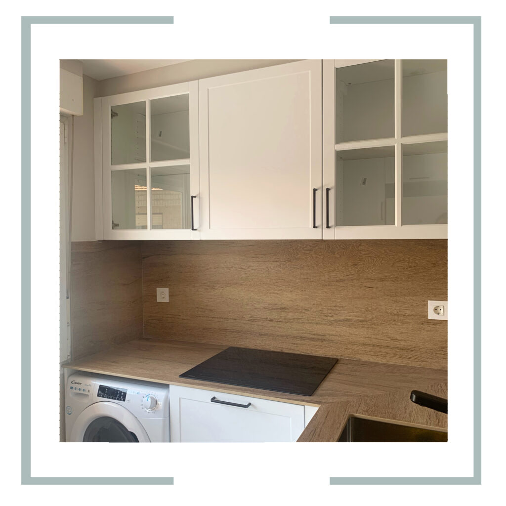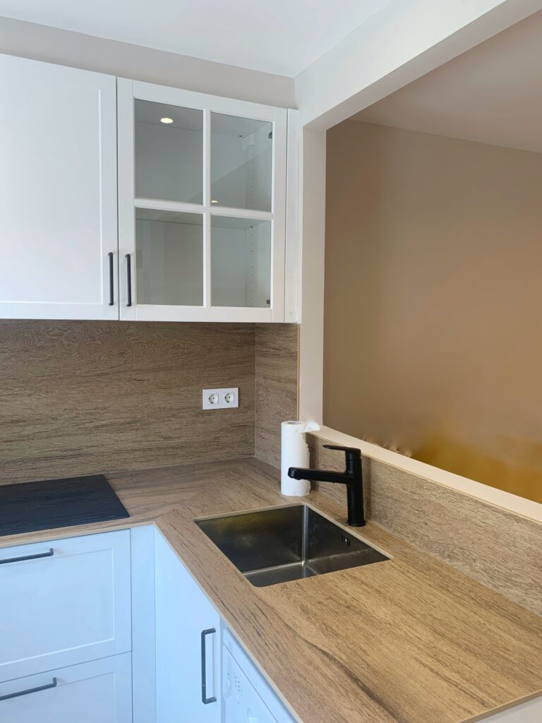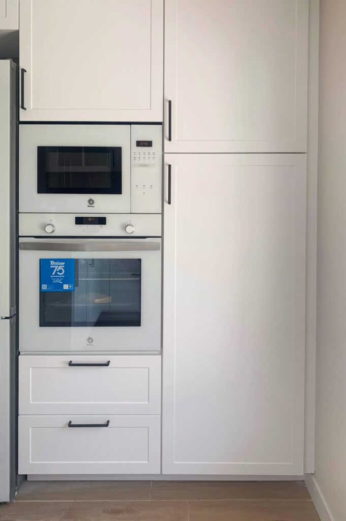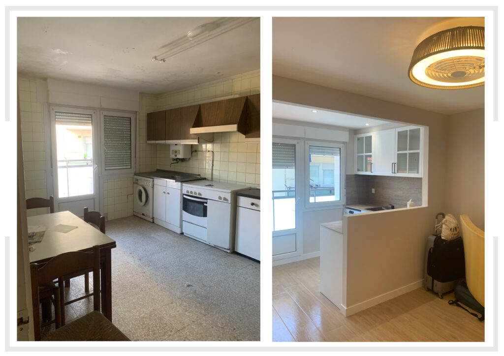 Aprovechando la gran cocina actual y reduciendo una de las habitaciones, se realiza una pequeña cocina suficiente para temporadas en la vivienda incluso el día a día, abierta al salón de la vivienda.