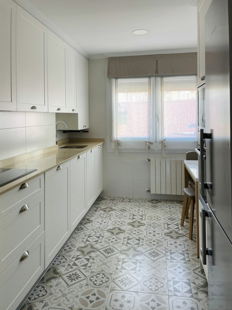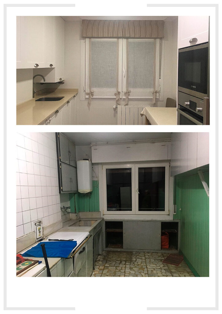 La antigua vivienda disponía de una gran cocina, con acceso a una despensa. Proponemos al cliente eliminar el espacio de la despensa, realizar una cocina cerrada más pequeña que la existente pero adaptada a los usos actuales. Y así aprovechar todo el espacio para abrir un gran salón comedor como zona de día.