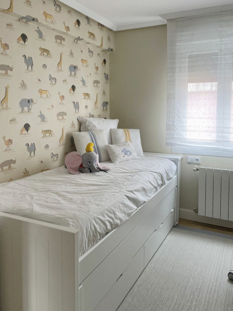 Con el paso del tiempo, los clientes van adaptando las estancias a sus necesidades, completando el dormitorio con los muebles necesarios para el pequeño y la decoración. En el dormitorio principal se elimina la cuna, y deja espacio a unas bonitas mesillas y cabecero.